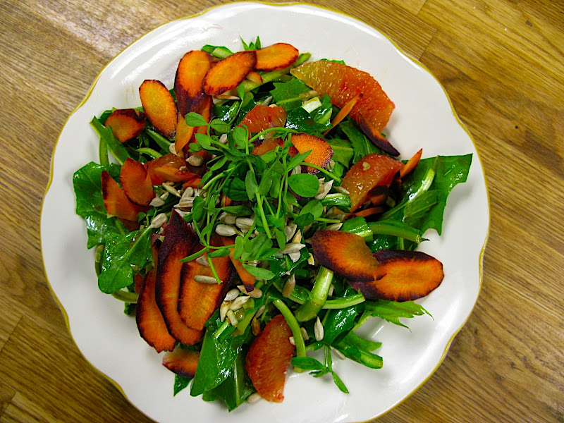 Dandelion Greens & Georgia Pea Shoots with Maroon Carrots, Blood Oranges, Baby Vidalias & Sunflower Seeds