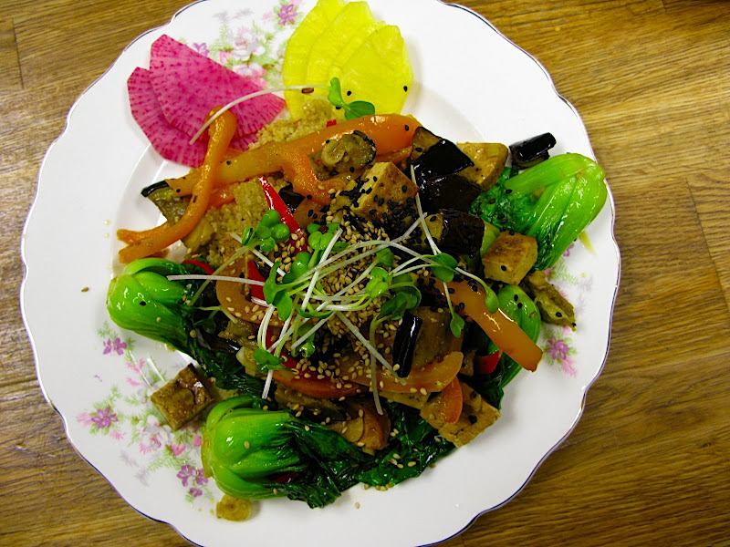 Baby Bok Choy, Tofu, Eggplant, Bell Pepper, Ginger, Garlic, Korean Pepper, Radish Sprouts & Sesame Seeds on Quinoa