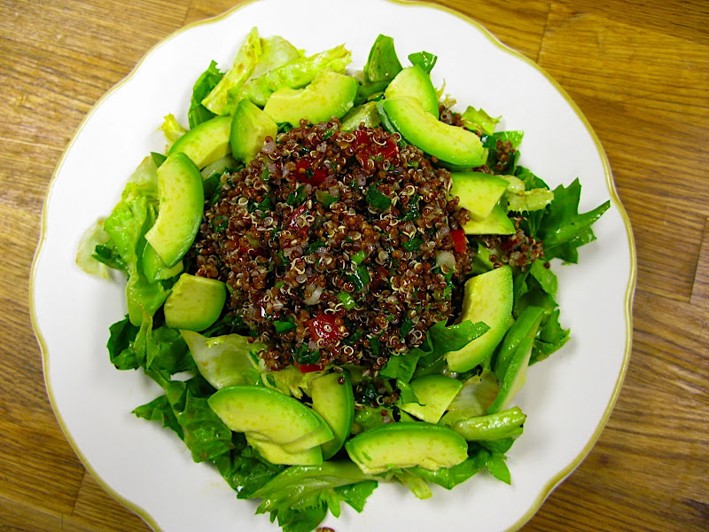 Red Quinoa Tabulleh on Green Leaf Lettuce with Avocado