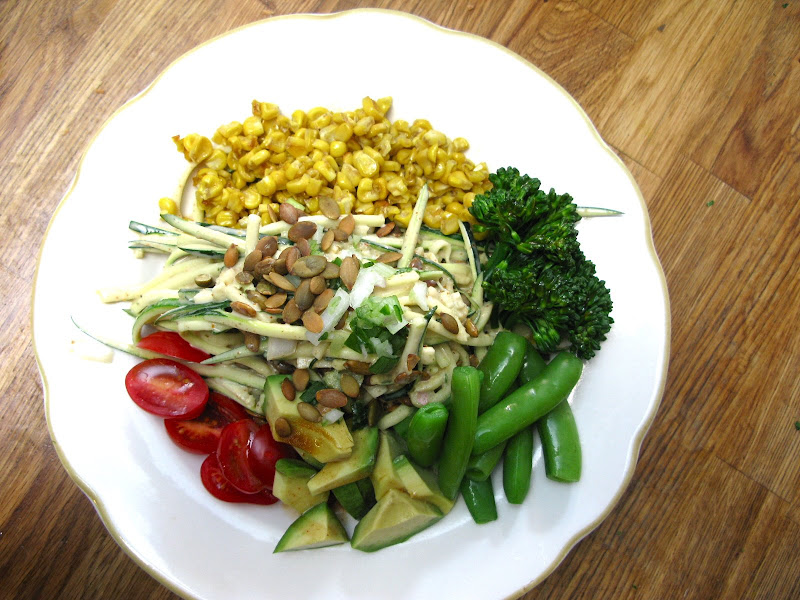 Raw Zucchini Spaghetti in Basil-Chili-Tahini Dressing with Roasted Corn, Broccoli, Sugar Snap Peas, Avocado, Grape Tomato, Baby Vidalia & Pumpkin Seed