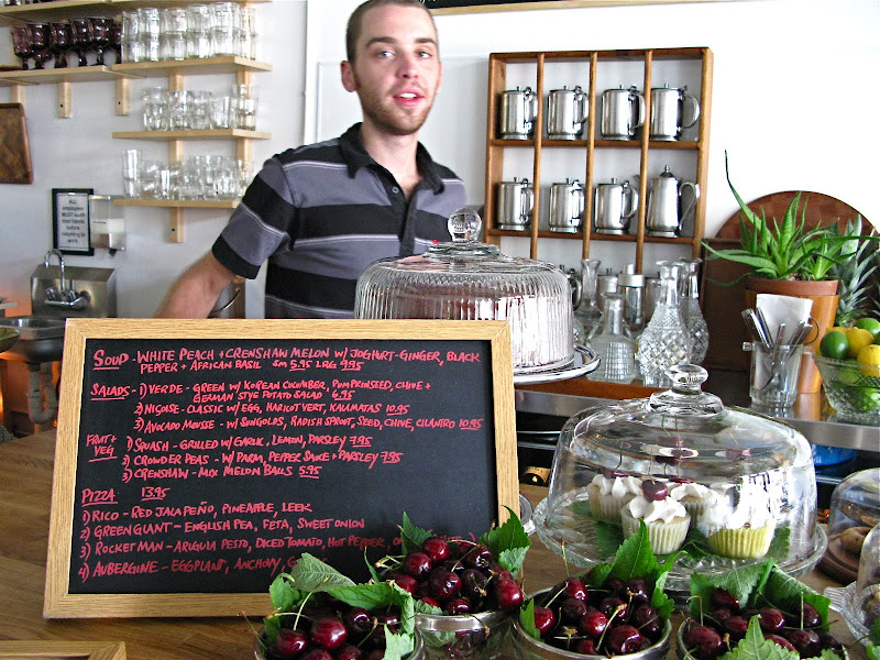 Bryan, a menu board, Maeda's organic chocolate cake, cherries (so perfect), the edge of Gail's spelt flour-walnut-strawberry-rhubarb thumbprint cookies , Cecilia's vegan lemon-ginger cupcakes, the aloe that started to thrive when moved out front...