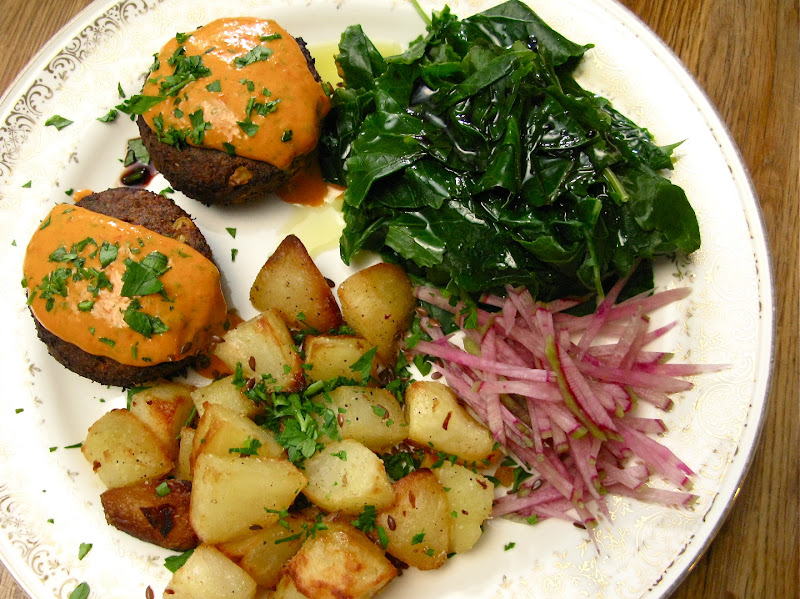 Tempeh-Georgia Corn Croquettes with Mild Pepper-Eggplant Remoulade, Flax Roasted Russet Potatoes, Steamed Georgia Baby Collards & Watermelon Radish