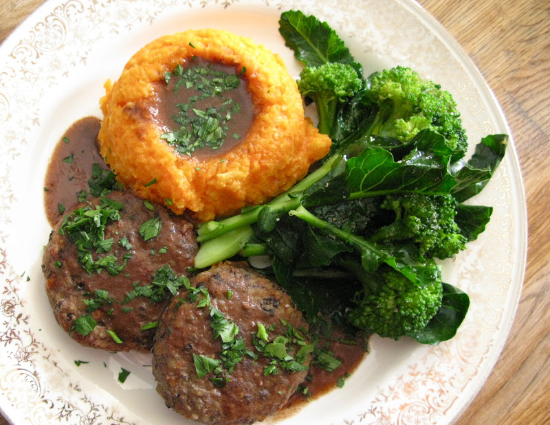 Beluga Lentil-Millet Cakes with Pea Gravy, Carrot-Parsnip Mash & Steamed Broccoli