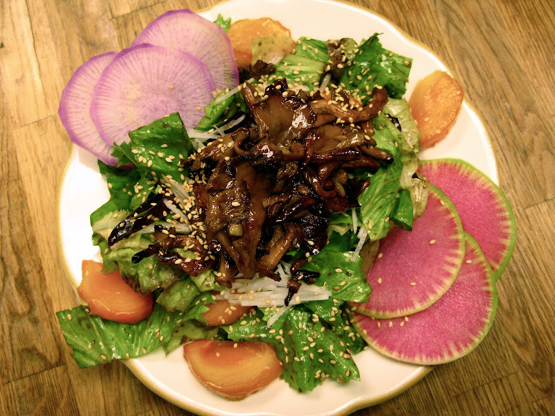 Dandelion Greens & Oakleaf Lettuce with Grilled Oyster Mushrooms, Watermelon & Easter Egg Radishes, Persimmon, Chambray Onion & Sesame Seed